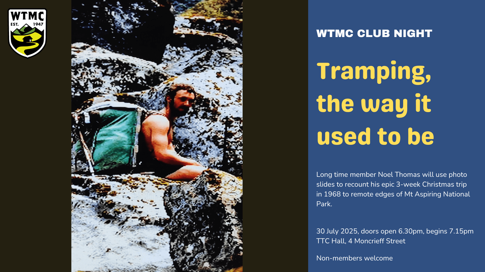 Long time member Noel Thomas will use photo slides to recount his epic 3-week Christmas trip in 1968 to remote edges of Mt Aspiring National Park. Doors open at 6:30pm for a 7.15pm start.