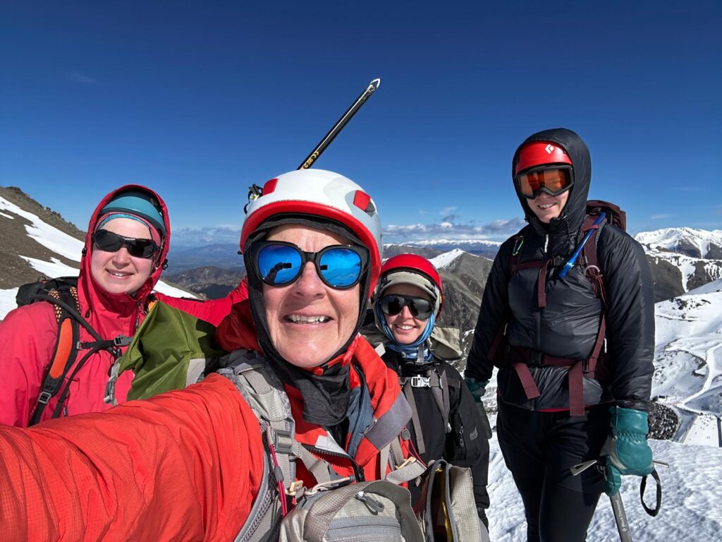 - Walk 100 m and put crampons on. Slowly make our way up a steep slope and along a ridge as the wind picks up.