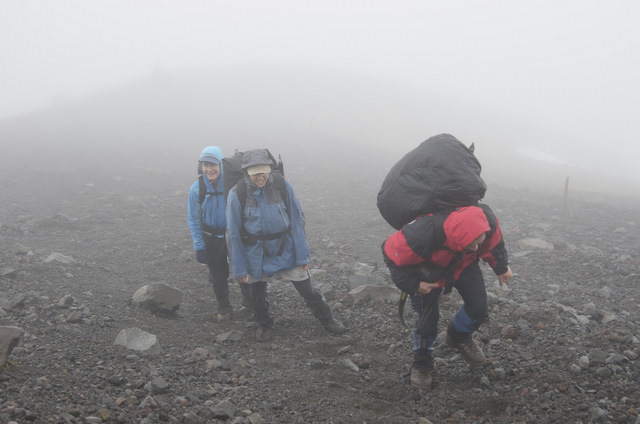 Oh don’t you hate it when you misinterpret the signals! We should have just kept walking on Friday night, all the way to the top! Saturday morning we awoke to clag and rain. No sign of you anywhere Taranaki and therefore no need to hurry. But already some of the party were getting bored and it was not yet 9am. Already Dmitiri and I were getting thrashed at cards. Visions of caged monkeys running riot in the zoo flashed before me. Would we have to tie them up and give them a light tap on the head with the ice hammer to subdue them? Fortunately Tony saved the day by escorting the young and the restless on a round trip to Lake Dive.