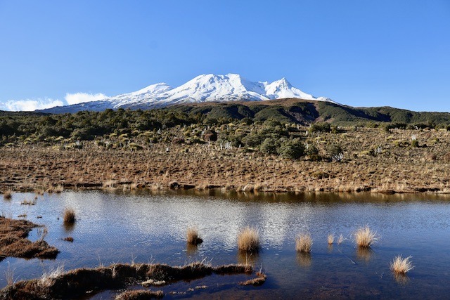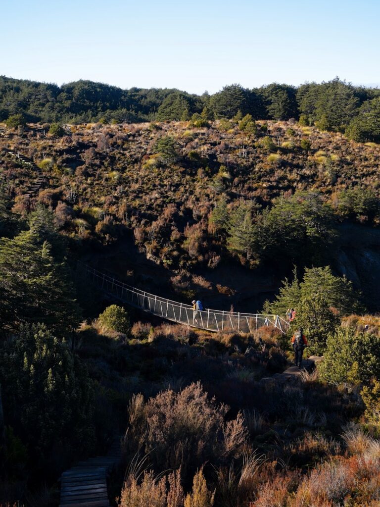 We retraced our steps down the Blyth Track and then turned east at the junction toward Mangaehuehu Hut. The track led us out of the forest and to sweeping views of Mt Ruapehu, gleaming in the morning light. The streams we crossed were tame, mostly ankle-deep now, and we enjoyed a few exciting swing bridges along the way.