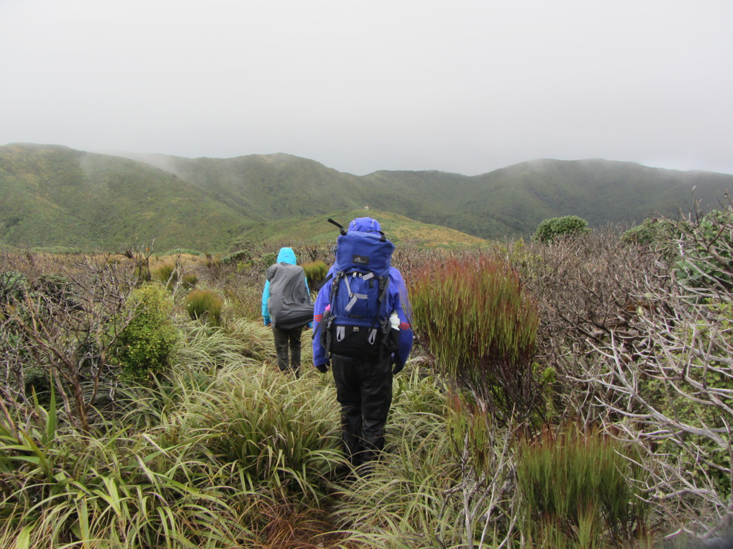 Near vertical hill. Grabbing tree roots and toeholds in the muddy earth. Right leg starts crammping during climb. Raining as we hit the ridge tramping out of the forest. Three of us Claire leads with Richard co-leader. Me the newbie. Tired wet with aching legs and twinging back.