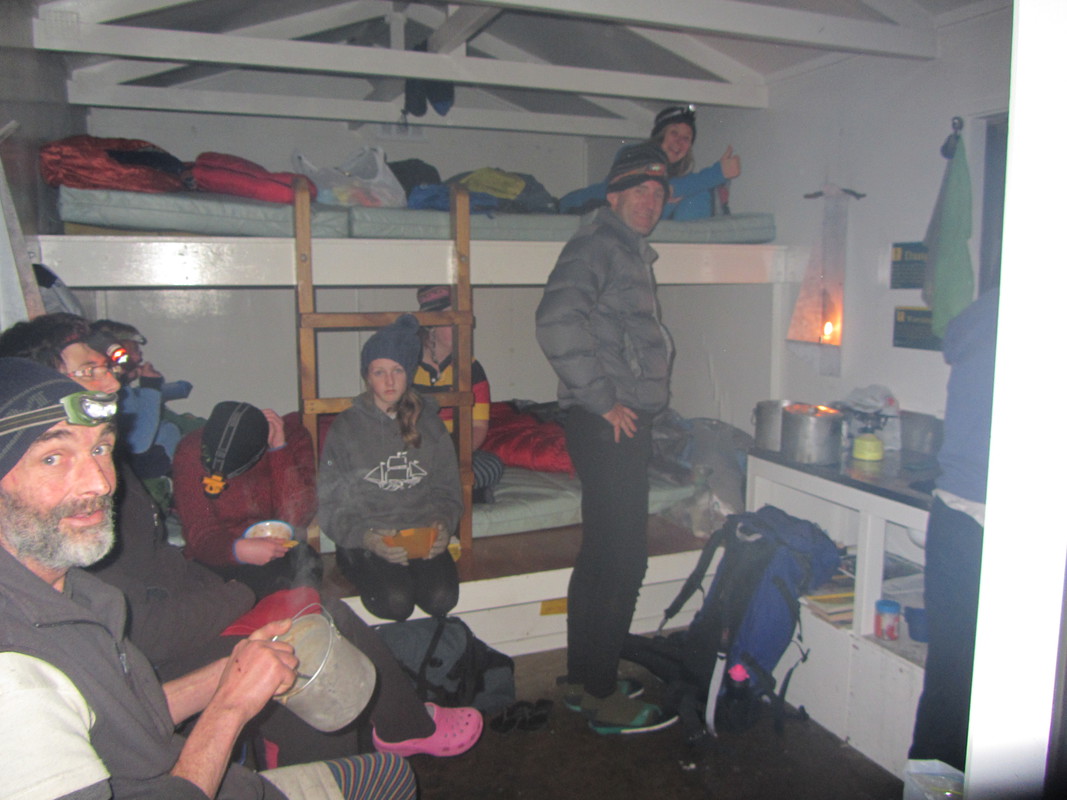 We step into Burn Hut. Small – drinks then resting. I half crawl into my sleeping bag when my left leg quad muscles cramp painfully. Finally rest with legs on the edge of locking.