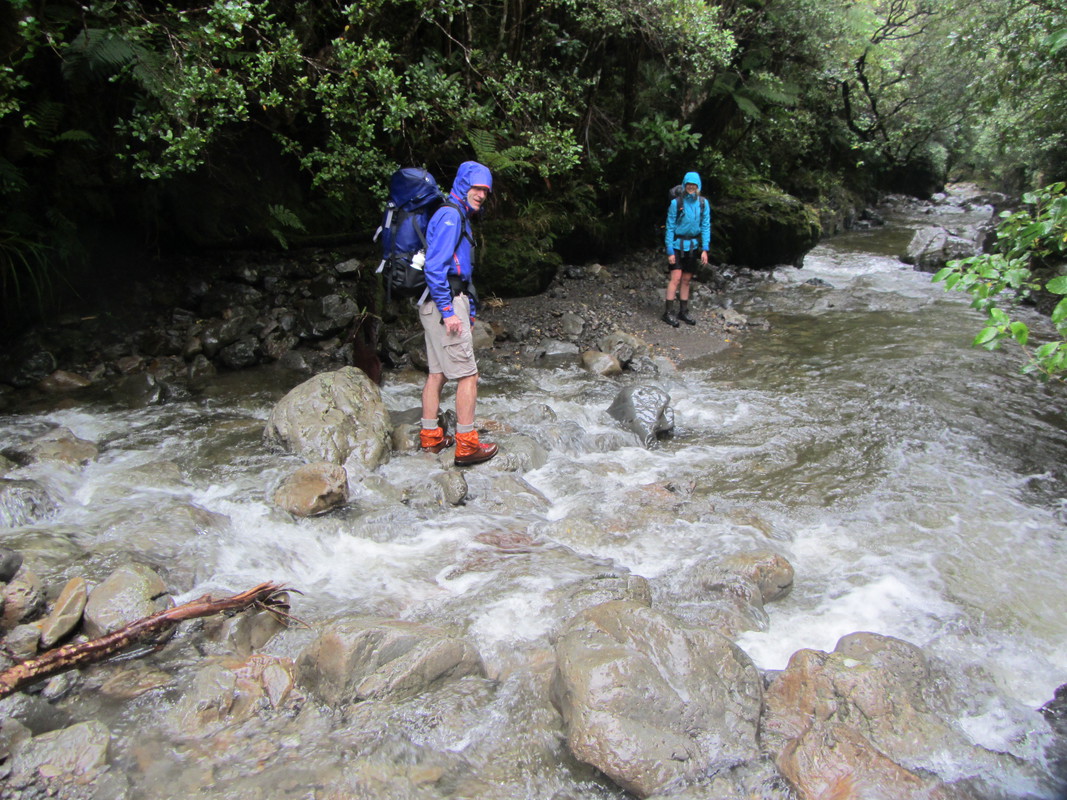 Make the bushline. Ridges and climbing over. Descending through the forest. Hours tramping go by and then we are at College Creek. Track finishes. Hour and half of crossing back and forth; rock traverse, rock climbing, rock hopping. And a near cc dunking. Out of the river -lunch. And get cold in the wind. Off around the dam. Mud and little bogs and a little more climbing get us to the van at Number 2 Dam. 5 hours of ridges hills and a river. Actually hears birds a half dozen times today. Only once yesterday.
