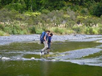 While lunch was being digested, the second serious lesson of bush-craft was taught – the river crossing. From the dry banks of the creek bed we listened to Amanda go through the basic rules of river crossings, the technique of linking up, and the importance of having a leader. The stick test was explained as was the importance of finding the right place to exit the river. Paramount in this section was the rule ‘ If in doubt – stay out’. Not crossing a river was the surest way of staying out of trouble and backing out of one, or even attempting a crossing, was done via a group consensus. Brown rocks were to be avoided as slip hazards and never ever take your boots off while crossing. All good tips for the uninitiated and points which were not lost on us as Amanda revealed that most fatalities in the NZ bush were drownings.