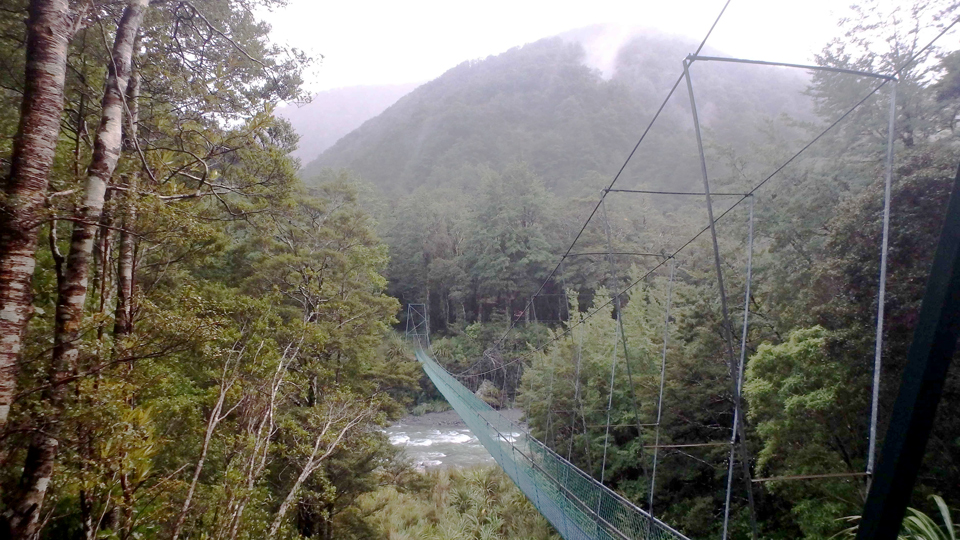 After a long descent we came to an opening along the Waingawa River and then back into bush. Due to the heavy rain a side stream had become quite swift and high so we crossed in pairs for extra safety.
