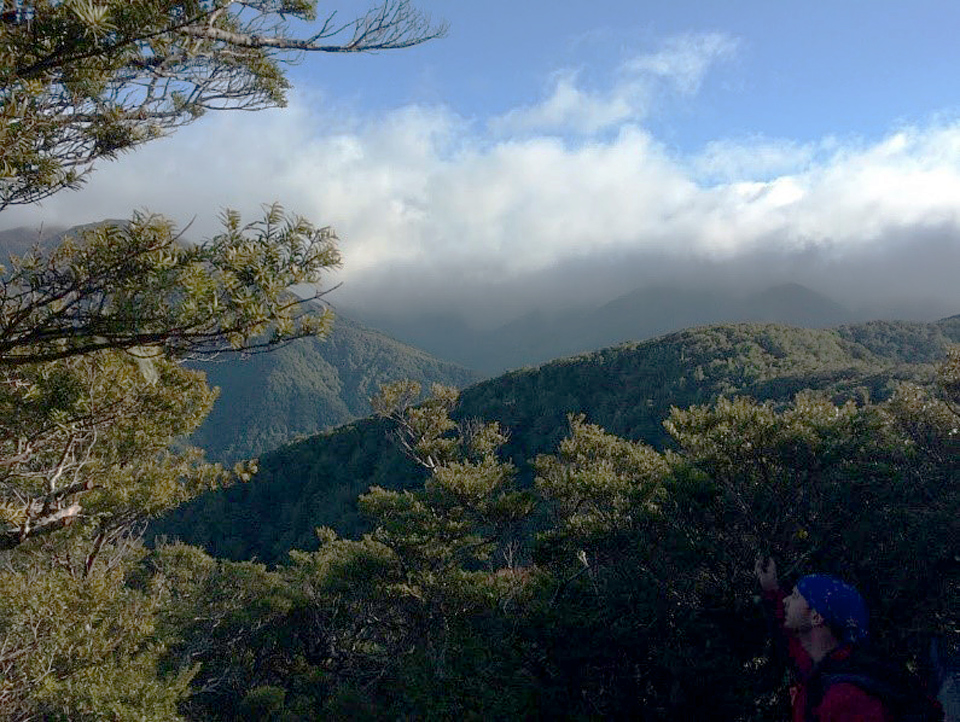 with some winds and clear skies on the tops. We took a detour to Blue Range Hut for a speedy lunch and to re-fill our water vessels, then started a muddy and fast descent to meet the EMs at the road end before 2 pm. We heard a few birds, saw a fantail and enjoyed the dappled sunlight through the trees.