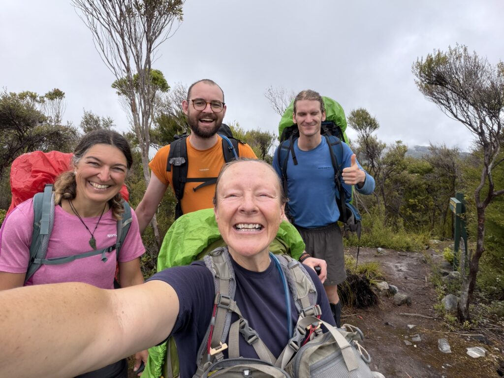 After flying in from Wellington the day before our shuttle arrived early to take us to the James Road end. We knew the weather was going to be a bit iffy today after fervently checking the weather forecast in the lead up to the trip start, but we were glad to see blue sky and some sunshine in Takaka. As we got closer to the road end the clouds rolled in and some flurries of drizzle came and went as we set off on the Boulder Lake track. This was a long day; DOC time estimates 8-10 hours to cover 22 kms. It took us 9.5 hours in total with plenty of rest breaks.
