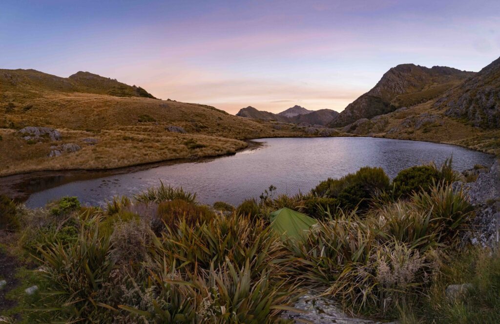 Once climbing the tussock spur to Green Saddle, it was beautiful views all around. There is quite the variety of travel on this part of the trip. There is a couple of kms of sidle through dracophyllum before emerging out onto the ridge top. This is a bit undulating and there are some bluffs and rocky outcrops to negotiate, but nothing too gnarly or exposed and is quite fun. A further sidle under the Needle, brings you up to the Needle’s Eye and a short and easy descent to the stunning Adelaide Tarn. The Hut is tiny (at a push you could probably get 5 in) and there is one camping spot just below the hut. This is a stunning place. There is also quite a lot to explore here. It is a quick jaunt up to Mount Douglas, which provides a good viewing spot of the Dragons Teeth high route. The Needle can also be climbed. If not continuing on to Lonely Lake, there is another track that can take you to Anatoki Forks hut, and out.