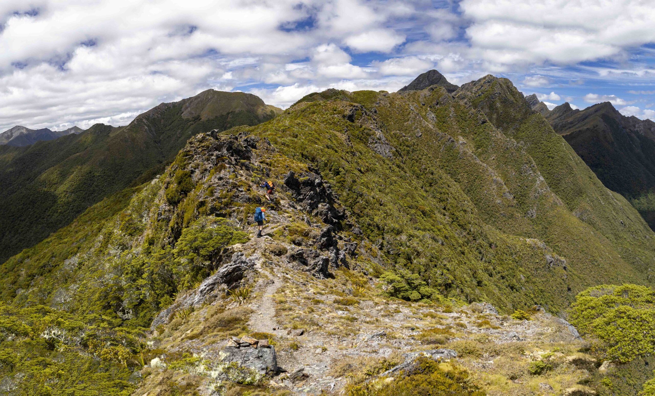 Cairned route from Lonely Lake Hut to Fenella Hut is fairly uncomplicated ridge travel but needs good weather as its almost exclusively out of the bush line. Takes about six-eight hours. There is a scree slope to navigate below Kakapo Peak. From Fenella Hut out to the Cobb Valley it is an easy four-hour walk.
