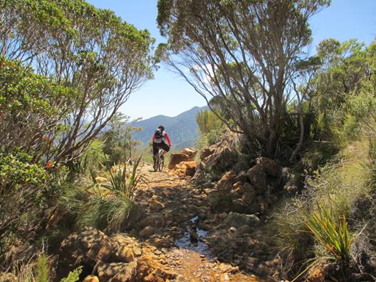 Maungatapu is a do-able ride but there’s quite a bit of pushing unless you are a strong rider. The down hills are exciting on both sides; Pelorus side because you can go very fast and Nelson side because they are steep and a little more technical. The views are pretty good. On balance we would recommend going from Pelorus as you can ride more of the uphill side and can ride down the sections you would be pushing up on the Nelson side. There are water sources on both sides but some gaps between the last stream on the way up and the first on the way down (including the amazing disappearing Maitai River North Branch). Bike bypass around road works in Maitai valley are catered for and the issue will probably pass before too long. Camping at Pelorus is a highly recommended variation.