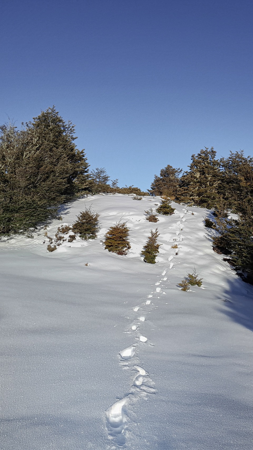The Black Hill Track was a gentle climb through beech forest that I really enjoyed – nothing technical at all. The snow started appearing as I climbed and by the time I got to the junction of Fosters Ridge Track I was fully in snow.