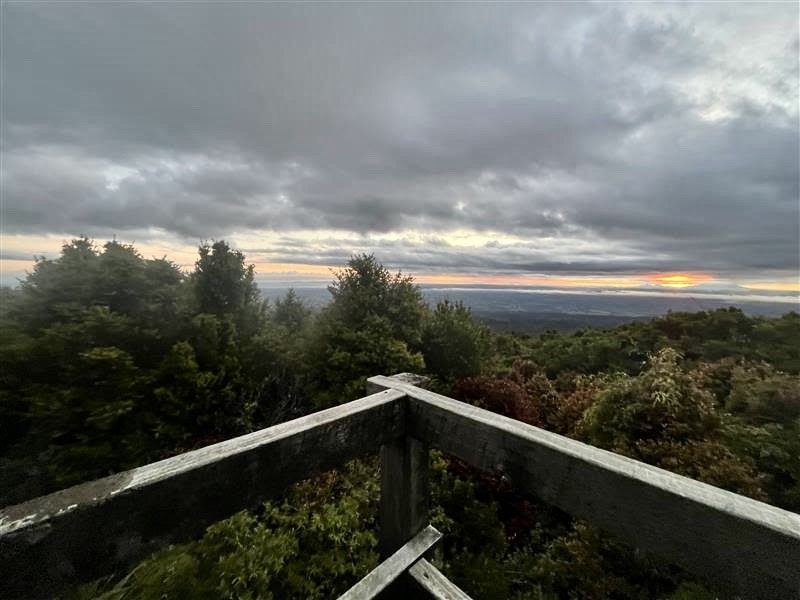 Saturday morning was… disrupted. We woke up to a stunning sunrise – views to Tongariro National Park to the East and forest all around. A dense layer of cloud to ~1300 m obscured our view of the bush-clad ridges. Less nice were the suite of rude awakenings: a summit crew leaving the Hut at 3:30 am, a little kid pointing their headtorch in other peoples’ eyes at 6 am and a birthday party that kicked off shortly afterwards. All of this served as motivation to get moving.