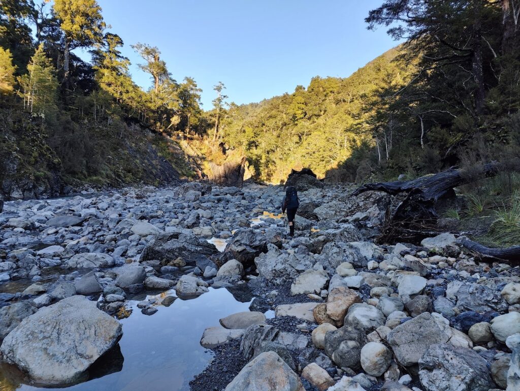 We crossed the swing bridge and headed off down the true right at 8am, with a chilly fog still sitting in the valley. We mostly managed to stay in the riverbed, with small stints in the bush. After the large slip marked on the topo map, we crossed the river 4 times. The river was cold, but not cold cold. You probably could have taken some high routes through the bush and avoided these crossings, but I doubt it would have been worth it.