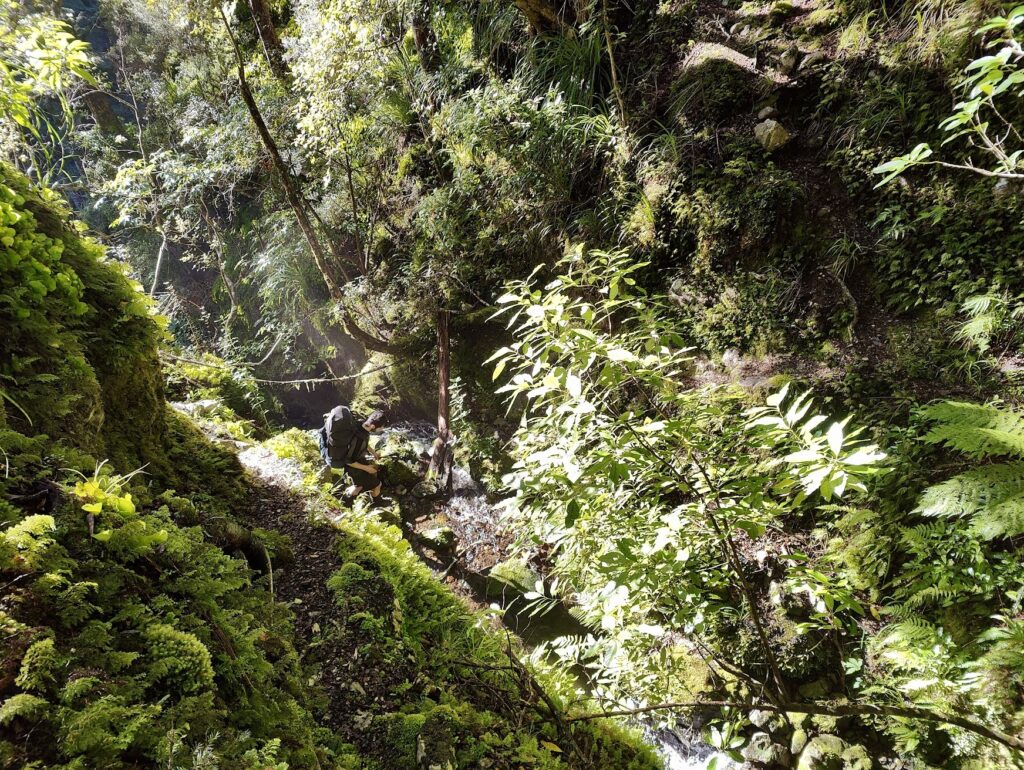 About 400m before the river’s confluence with Cleft Creek, I stopped to scope out a route down stream. James very kindly pointed out the orange marker I was standing right next to, and we followed these markers up the bank into the bush, and then promptly lost the track in a sea of ferns. The contours around Cleft Creek were a bit deceptive – living up to its name, it was quite a chasm. We wandered a few hundred meters upstream before finding a delicate route down and up the other side.