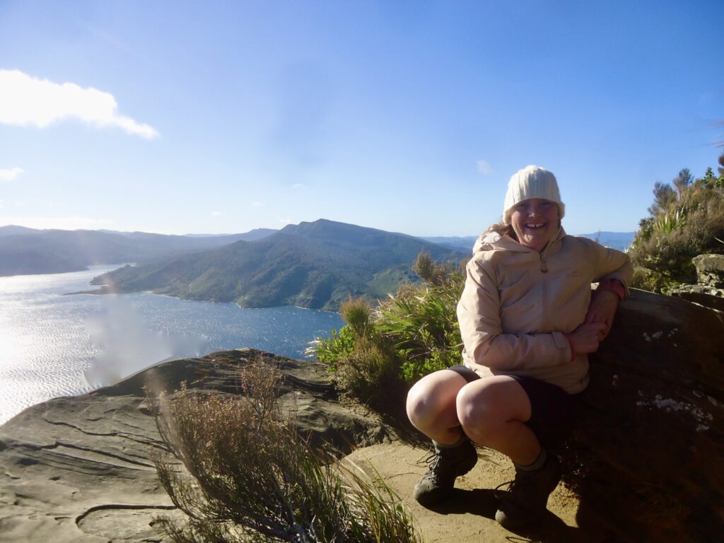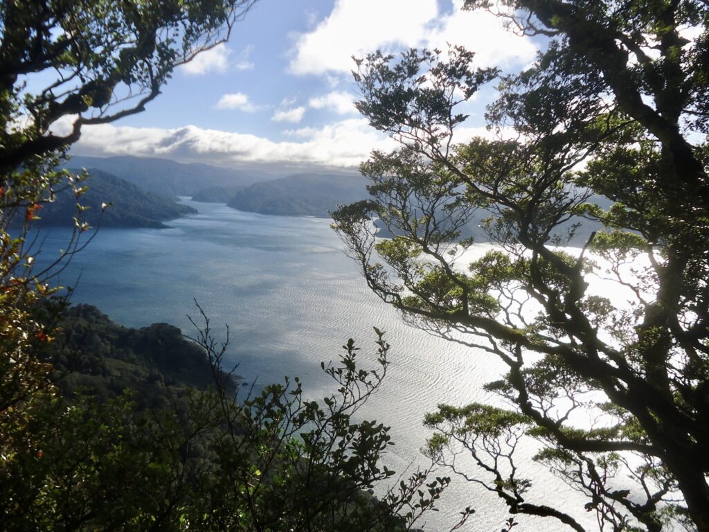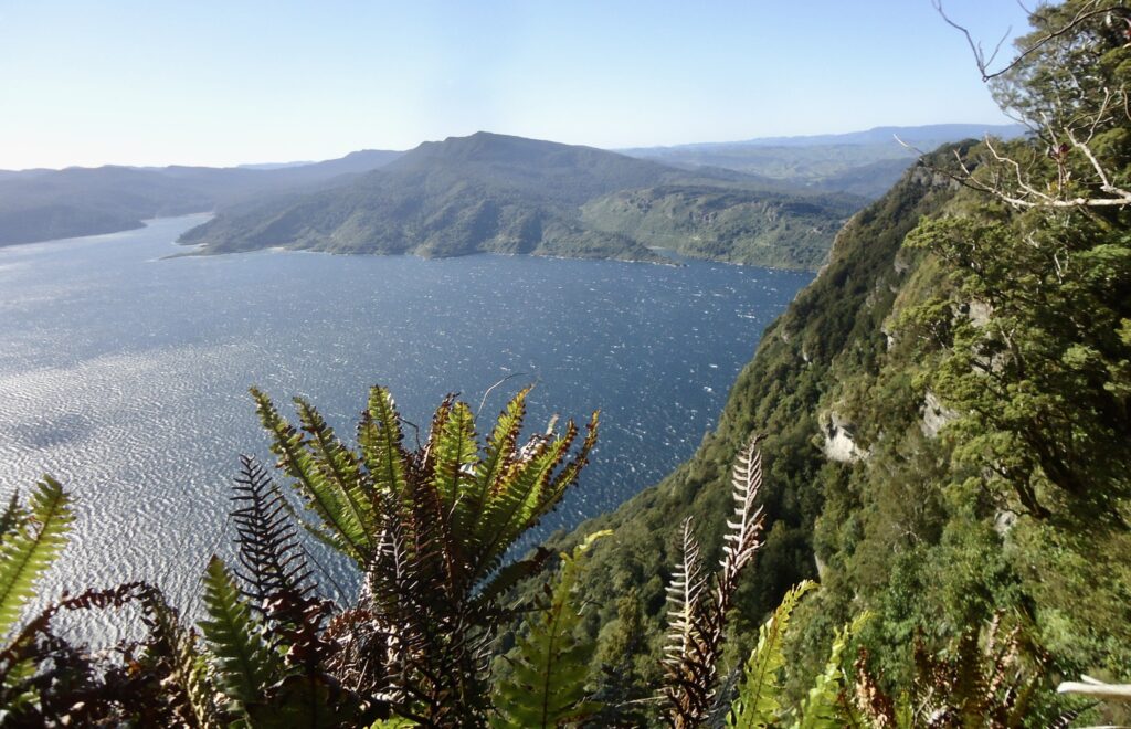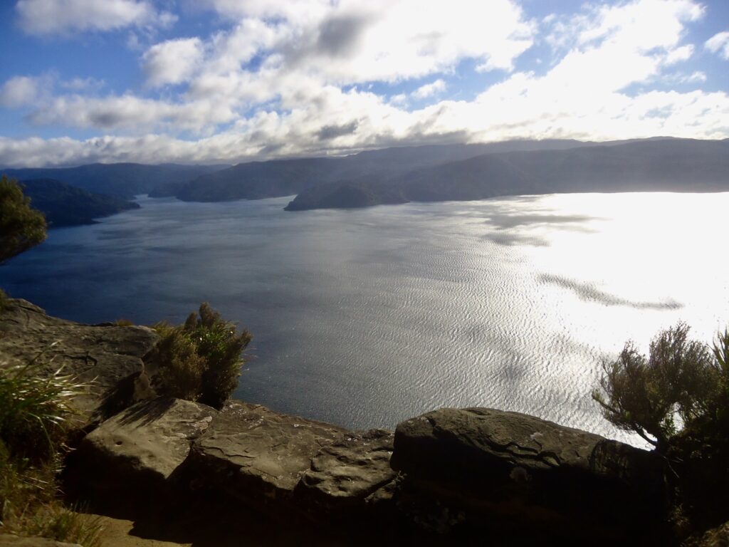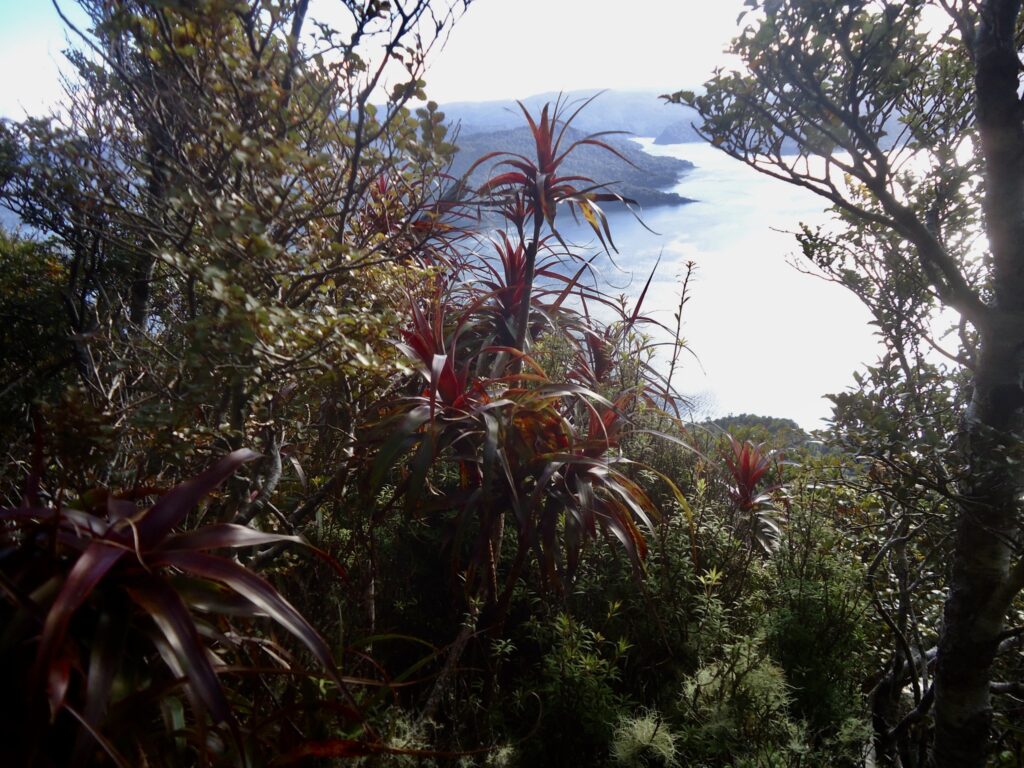 We resumed climbing Panekire Bluff at 9:30am. Although the wind was strong, we were sheltered from most of it as the walk up is under the bushline, the wind was blowing towards the Bluff and the track was in the lee of the wind. There were many lookout points along the way, made of flat sections of rock away from the bushline, where you get amazing views across the Lake in all directions. We all enjoyed checking these out, although it was a bit too open for some members of the group who were not keen on heights. Jacqui took as many photos as opportunity allowed.