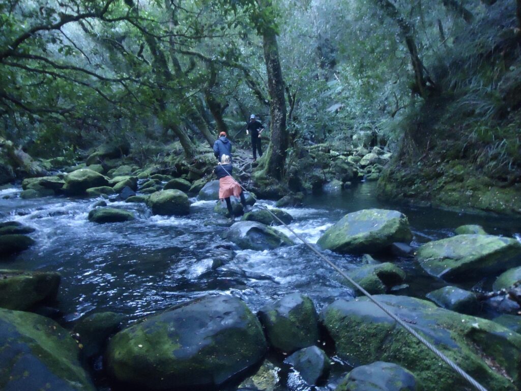 We reached the track junction which led to Korokoro Falls at 12:20pm. We followed Korokoro Falls Track to the Falls, walking alongside Te Korokoroowhaitiri Creek most of the way (which is more like a river). Near the end the track, the track leads you to the side of the Creek, and there is a thin steel wire attached to trees on each side of the Creek. You need to cross this to continue on the track up to the Falls. You need to hold onto the thin wire with your hands and step on boulders to get to the other side.