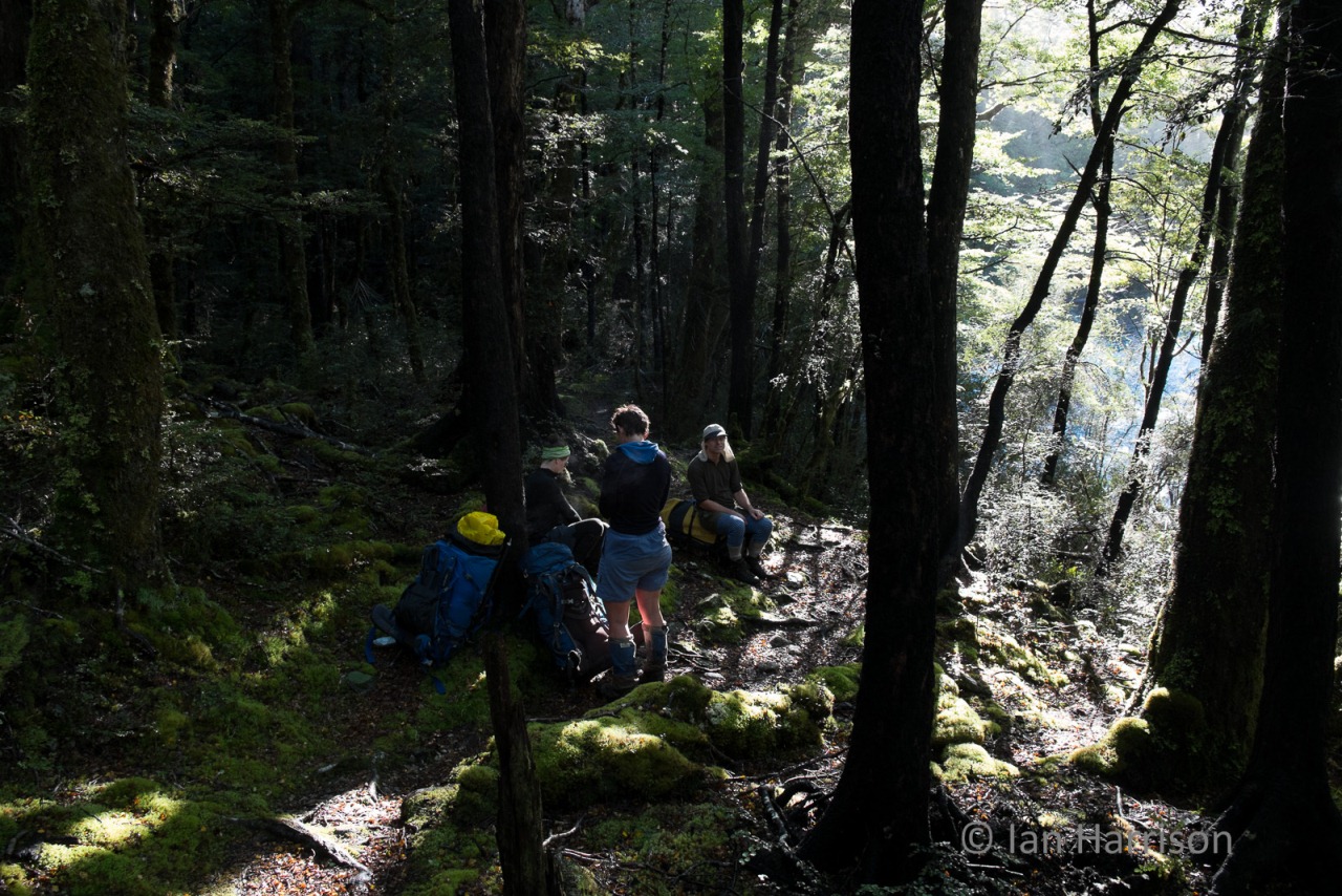 We stayed in the shelter by Lake Rotoroa that night and then got the water taxi on Friday morning; by-passing the extensive tree fall of the lakeside track. Although the trip was classified as medium-fit, Debbie, Megan and I were keeping a solid medium pace up the Sabine Valley. Our trip leader David had no choice but to keep this pace too, although we all knew he would have been faster without us. We stopped for lunch at the West Sabine Hut, then continuing on the track towards Traverse Saddle but turning off just before The Chasm.