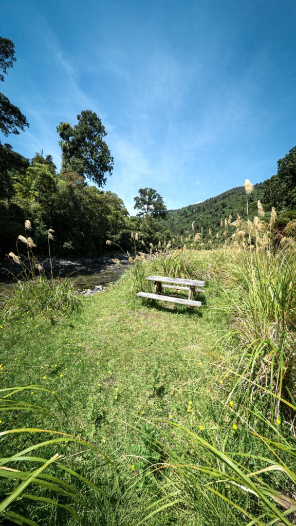 About halfway between the start of the river travel up the Ōhau and the North Branch junction is the famous Picnic Table on a grassy flat. If you are considering travel times then given a low river flow the time between the start of the track and the table would likely be faster on the track, but faster in the river for the top section. So, it is mix and match—and you will get there eventually either way. And having the options makes for a nice day-trip loop.