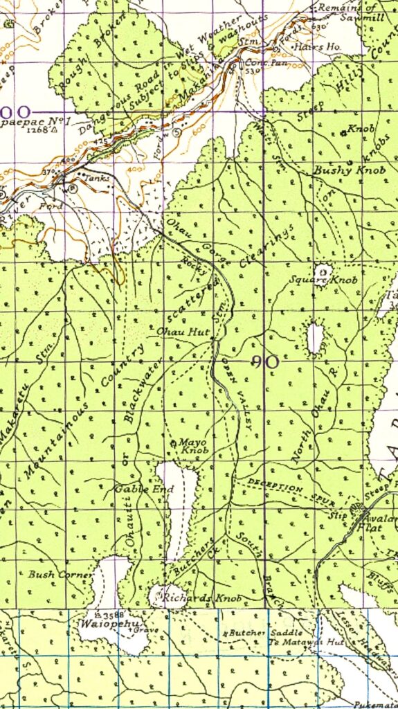 The 1959 topomap shows Ozzie’s Track (un-named on the map) on the western side of the Ōhau River starting just beyond the junction with the Gable End Ridge track and continuing to the North Ōhau River junction, and then further on the eastern side to the present South Ōhau Hut and beyond.