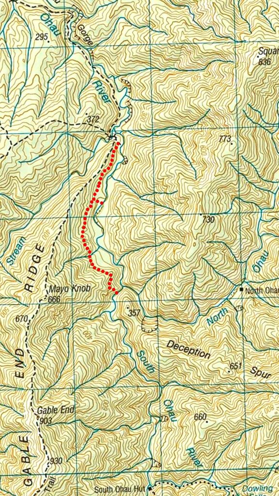 The upper end of Ozzie’s Track is not where the 1959 map shows but is in the South Branch of the Ōhau River about 100 m above the junction with the North Ōhau. It is only marked with some red and blue tape (just visible in the centre of the photo).