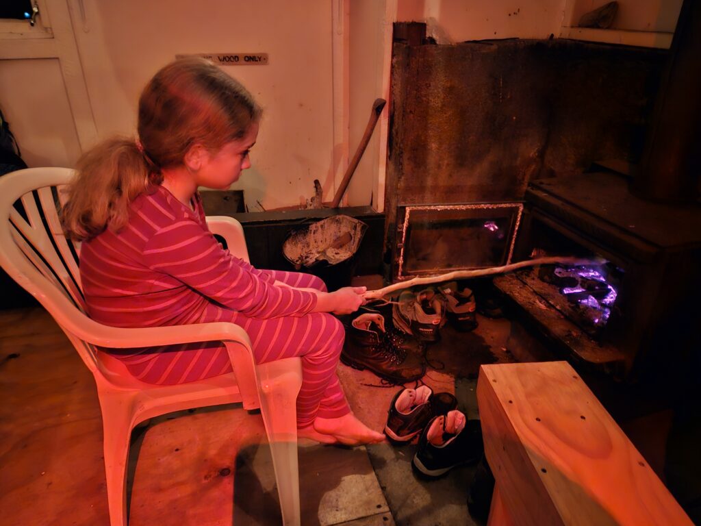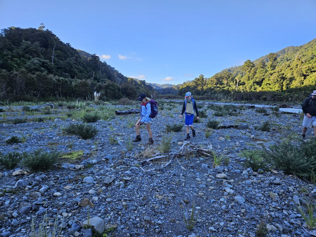 Once the river’s pace had slowed and the water level had lowered, we went back and my mum’s friend taught us how to cross the river. We all linked arms, walked into the river and then shuffled diagonally towards the other side. We repeated this process about ten times until we got to Paua Hut. The Hut was really nice – it had toastie makers and coffee plungers!