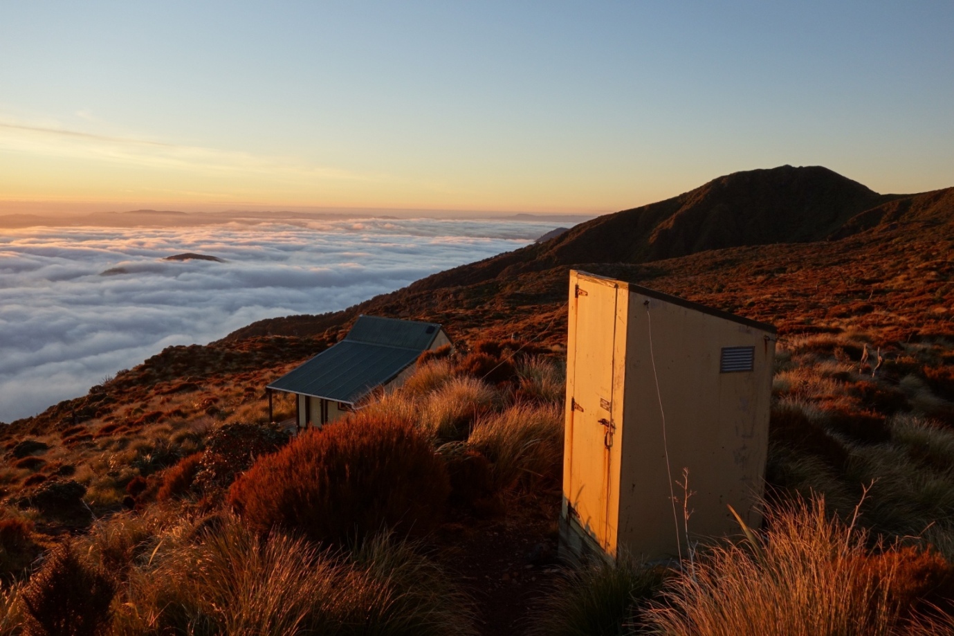 We rested again at Tarn Bivouac, a bright orange tin-can nestled like Howlett’s into the hillside. It had a surreal air to it, with what could have passed for a closely cropped lawn out front, fringed with mountain buttercups. The ‘toilet’ stood further away on the eastern side of the ridge overlooking the plains – or overlooked by the plains: it had no walls at all, only a seat on a base! Great view, but not a perch to be on reading the latest Wilderness magazine in less than perfect weather.
