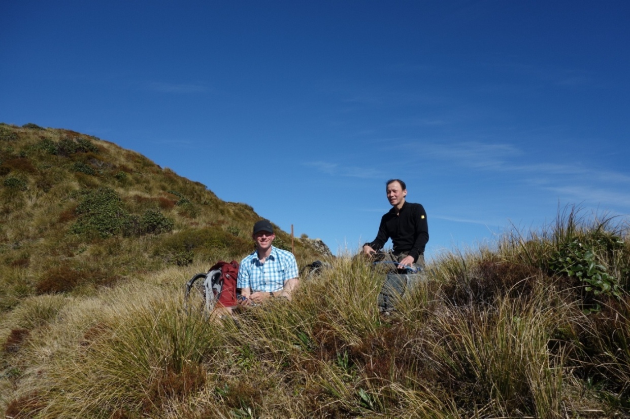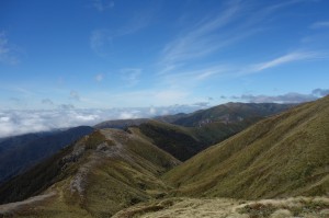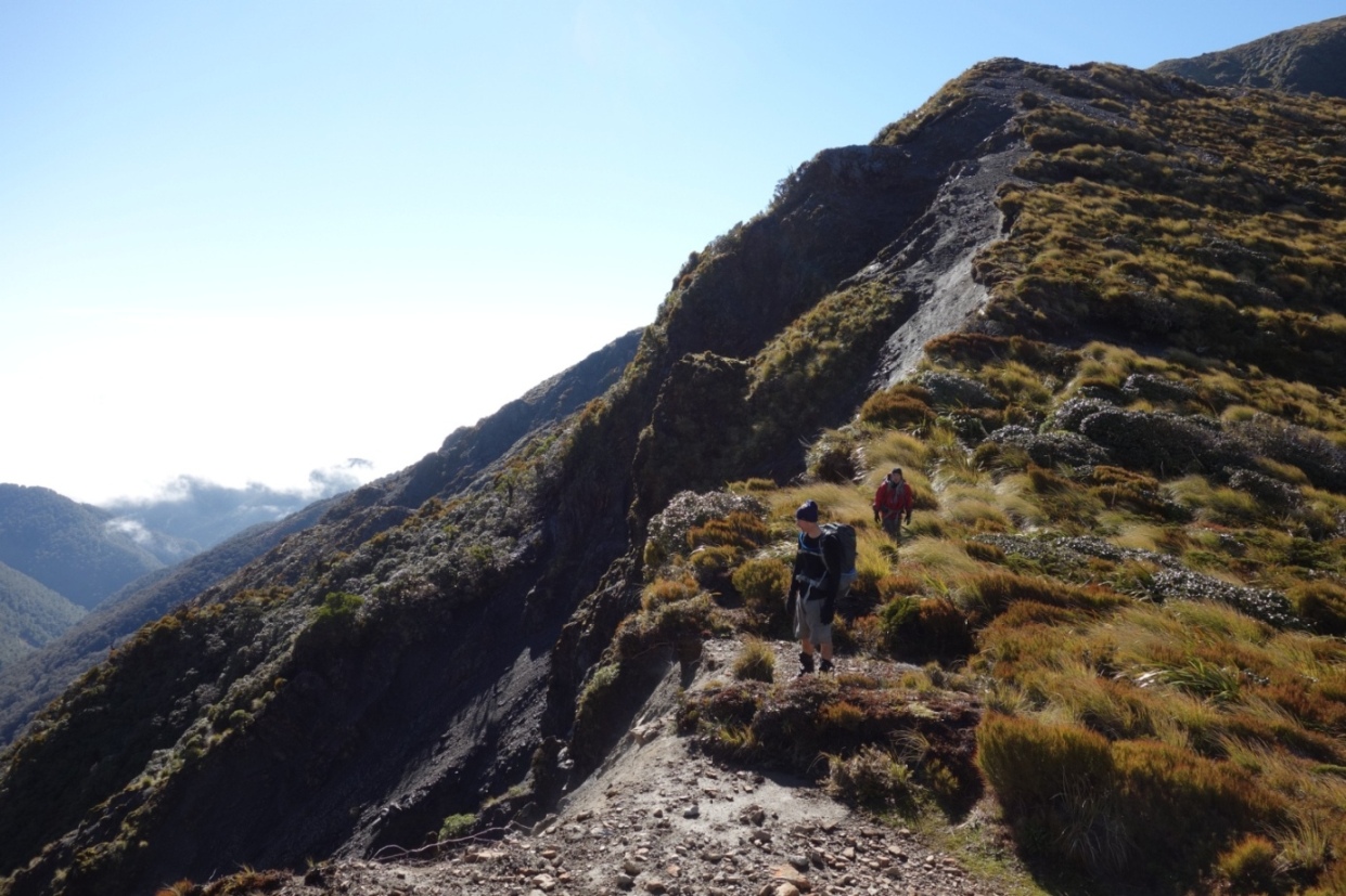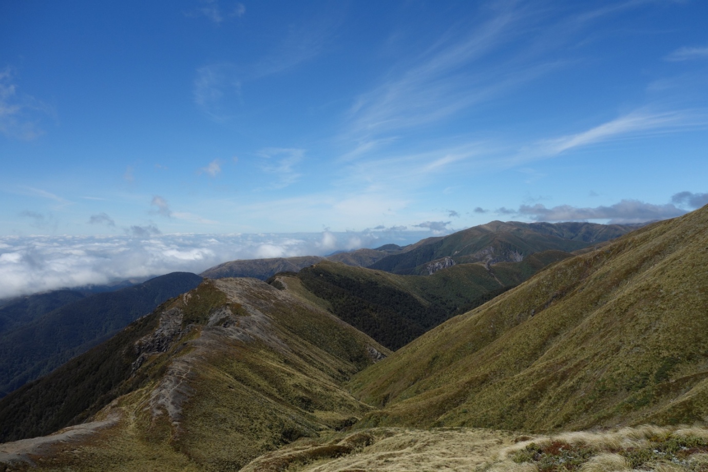 Sawtooth Ridge is aptly named. It’s like the Broken Axe Pinnacles on steroids, strung for around two kilometres between Tiraha and Ohuinga (1686m) peaks. Despite briefly being obscured by clouds, we had perfect conditions for the crossing: it is not something I would like to do in strong winds or rain, with considerable drop-offs on both sides. We threaded around, over and between the rocky outcrops to find a stinking-hot grassy hollow in the saddle below Ohuinga where we stopped to get sunburnt and have lunch. It wasn’t the towering hulk of Ohuinga or the long stripe of Black Ridge that served to winkle us out of our recline – the thought of being up there in the incoming weather moved us on.