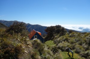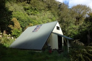 We legged it over the remaining ridge to plunge into the valley below and onto Daphne hut, making a mockery of the signage times. Must have been for the uphill walk. Walking backwards. With a zimmer-frame.