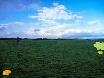 But soon we were on our way again and it was now quite pleasant walking down the river bed. As we neared the coast the sky lightened and the rain cleared. We climbed to a grassy headland and there in the farmer’s paddock was a green mother hippopotamus with a calf, an orange rabbit, as well as the usual white sheep. Ed was not surprised by these animals anymore and in fact was quite obviously becoming more partial to them all the time as she now seemed to be expecting them every time we stopped.