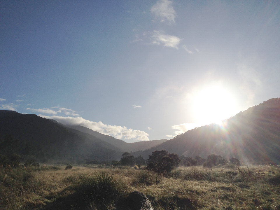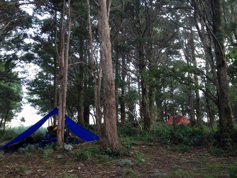 The campsite setting was in among a cluster of trees, a sheltered spot off to the left of the Flats about 15 minutes walk from Totara Flats Hut, and a stone’s throw from the Waiohine River. At dusk you could see a tuft of smoke rising out the top of the trees that were our walls for the night.