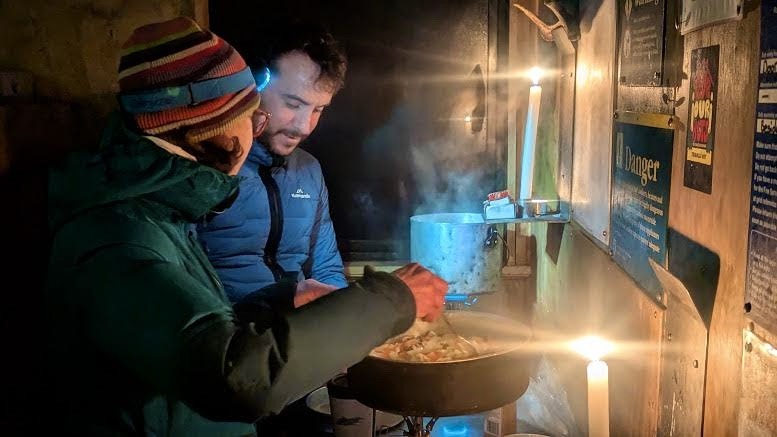 • Six of us slept inside (it’s a 6 bunk hut) and Kirsty, Sam and Josh decided to continue with their plans to test out their new tents. They found spots in the bush on the sides of the hut. Despite a warm invitation to bail to the Hut during the night (there would be room for mats on the floor), they all reported having a cosy nights sleep in their tents, albeit with the slightly rocky ground.