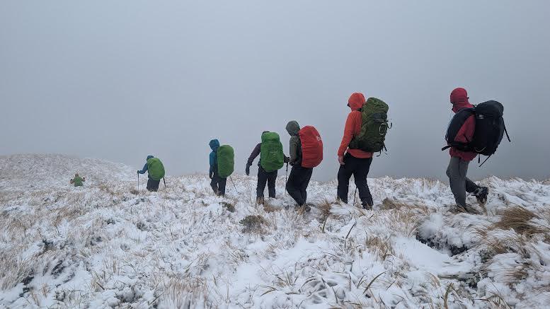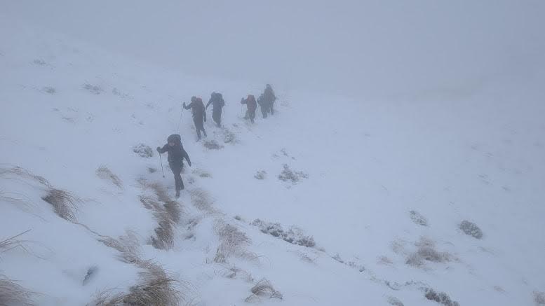 • The snow thickened, covering the tussock and creating a definite winter wonderland, but it made our travel quite challenging. We were all very grateful to Dave for his footprint stomping at the front of the group!