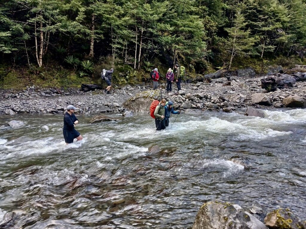 • Hitting the bushline, we embarked on the very steep descent down to Triangle Hut. The Oharu River in front of the Hut was flowing swiftly, so some good river crossing skills were utilised to get everyone across!
