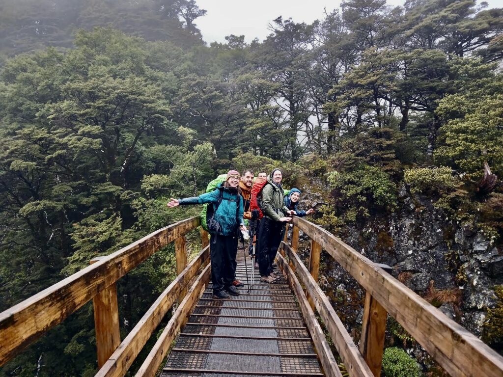 • We stopped for obligatory group photos at the arched wooden bridge. While standing on the bridge, we admired the dizzying distance between us and the Mangahuia Stream 70m below. It’s definitely not a typical 1-2 person DOC swing bridge. A very sturdy construction!