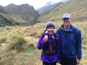 Then there was the issue of the weather forecast – heavy rain, snow to low levels and gale force winds. We expected to be on exposed tops for at least 10 hours. Our focus switched to ensuring we had the right gear and a race strategy. As race day drew nearer we scrambled to acquire light weight crampons, the item on the compulsory gear list neither of us owned. Tim bought one of the last pairs of crampons available at Bivouac Wellington. They were a size too small for his trainers but if he didn’t wear them he’d be able to swap them for a pair the correct size when he got back to Wellington and no longer needed them! I bought a more expensive but matching pair in Wanaka after it became clear that for the first time in the race’s history the race organisers were going to require us to carry crampons. I reluctantly conceded the pair I had borrowed expecting to leave in the gear trailer would be too bulky and heavy to run with.