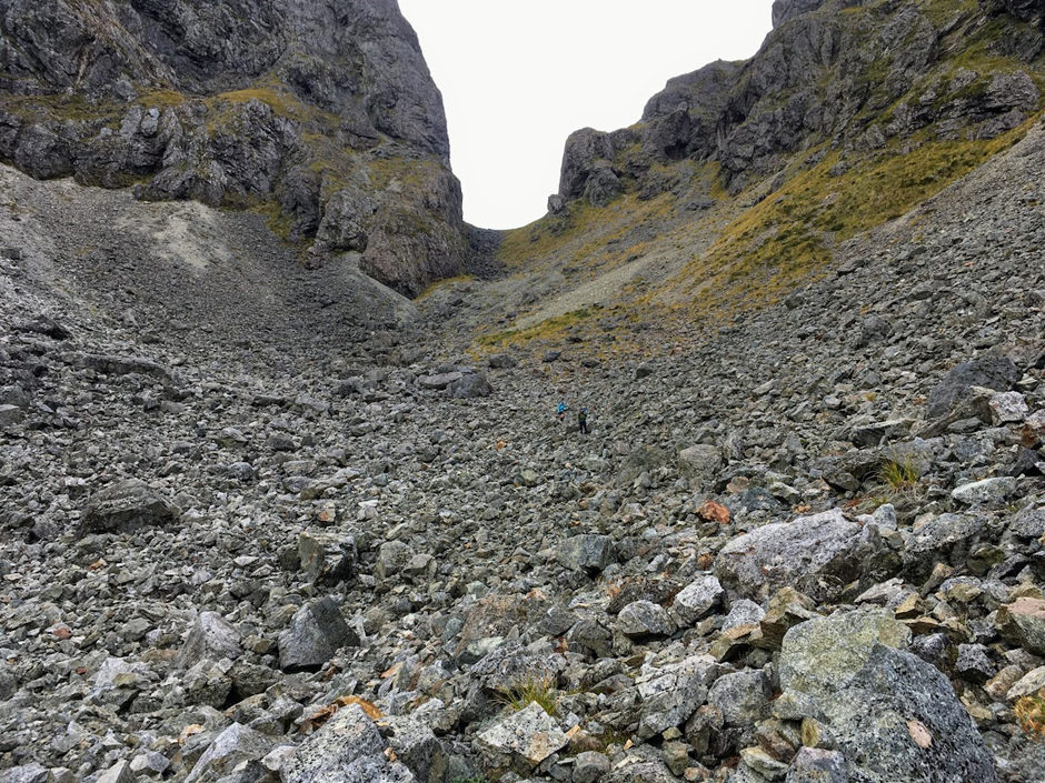 We arrived on the pass at about 3pm, took some photos and ate lots of lollies. The first section down from the pass was gravel and had a nice wee track along it. However, once the gradient steepened, we were funnelled into the rocky river bed. It was a bit of a grind for me getting down, but it was pleasantly broken up by the spotting of at least three rock wren. I also noted that the river came above ground for a section up here, so contrary to some trip reports we had read, there was an opportunity to get water on this side of the pass (but this may not always be so).