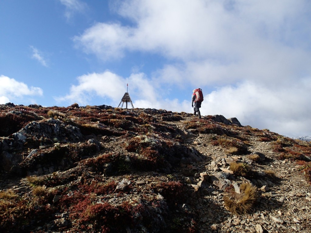 From here we followed the ridge-line in a westerly direction dipping back into the bush line after a couple of Kilometres where the track zig-zagged among the stunted bush which slowed our progress somewhat.
